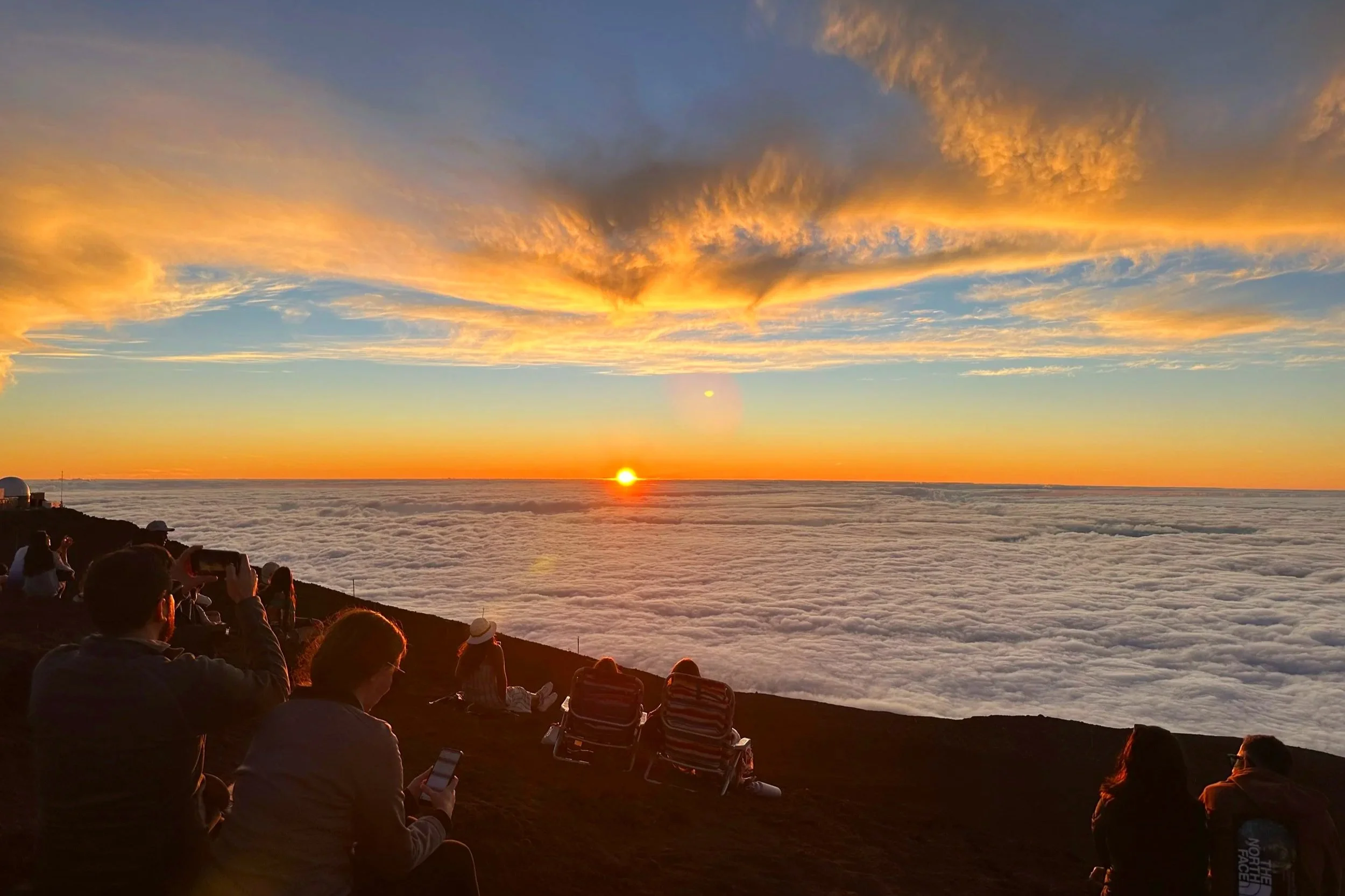 After our surf lesson, we stopped at Ho’okipa Beach to watch windsurfers and water surfers on much bigger waves than the ones we practiced at. Then, we drove to Haleakala National Park, known for its sunrises and sunsets above the clouds. The road up the mountain was winding, but not too bad. Definitely not as winding as the alternative plan to our day: the road to Hana.